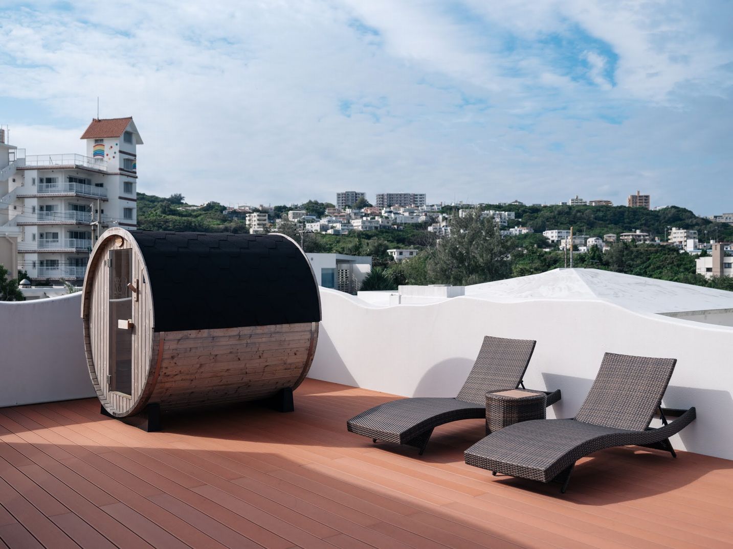 沖縄の青い空の下で身体も心も解放ししっかりと整えプライベートサウナでリラックスしてください。