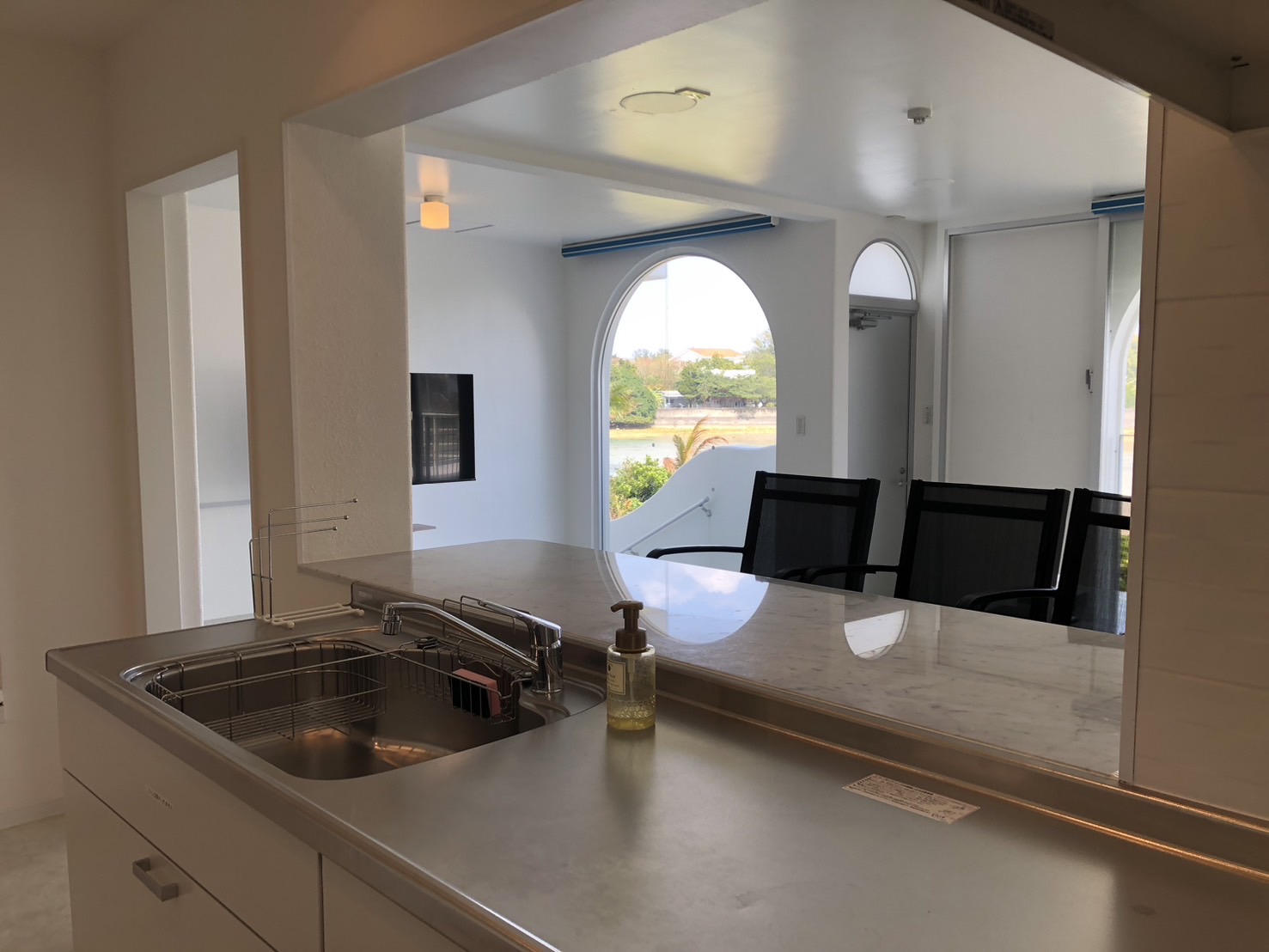 海を眺められれる広々としたくつろぎのリビングから直接海へとつながるお庭に出ることができます。キッチンからは、カウンター越しにリビングとつなっており。会話も弾むお食事シーンを演出します。白を基調としたシンプルな空間になっております。
